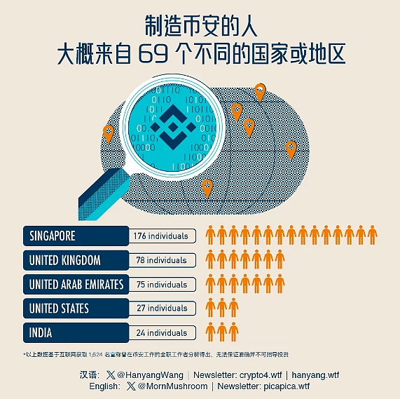 如果目光不僅限于全職工作,那么我們筆記本上的 3714 位和幣安有過合作關系的人一共來自 114 個國家。這可比 Apple Store 的范圍廣多了,全世界只有 26 個國家或地區有 Apple Store。不過全球有 167 個國家或地區可以用 Apple Music,但在官網上幣安明確提供支持的國家或地區只有 47 個。