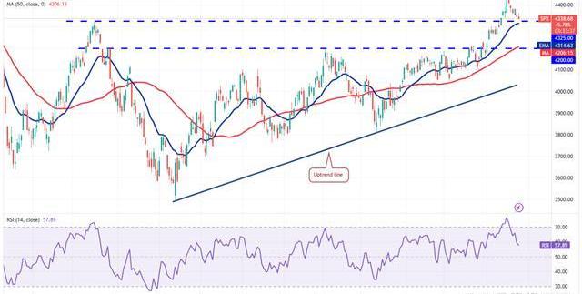 如果價格從20日均線反彈,則表明市場情緒依然牛市,交易者將下跌視為買入機會。此后,多頭將嘗試將價格推高至4.448以上并恢復上升趨勢。如果他們成功,該指數可能會嘗試反彈至4,650點。4,500點有一個小阻力,但很可能會被突破。