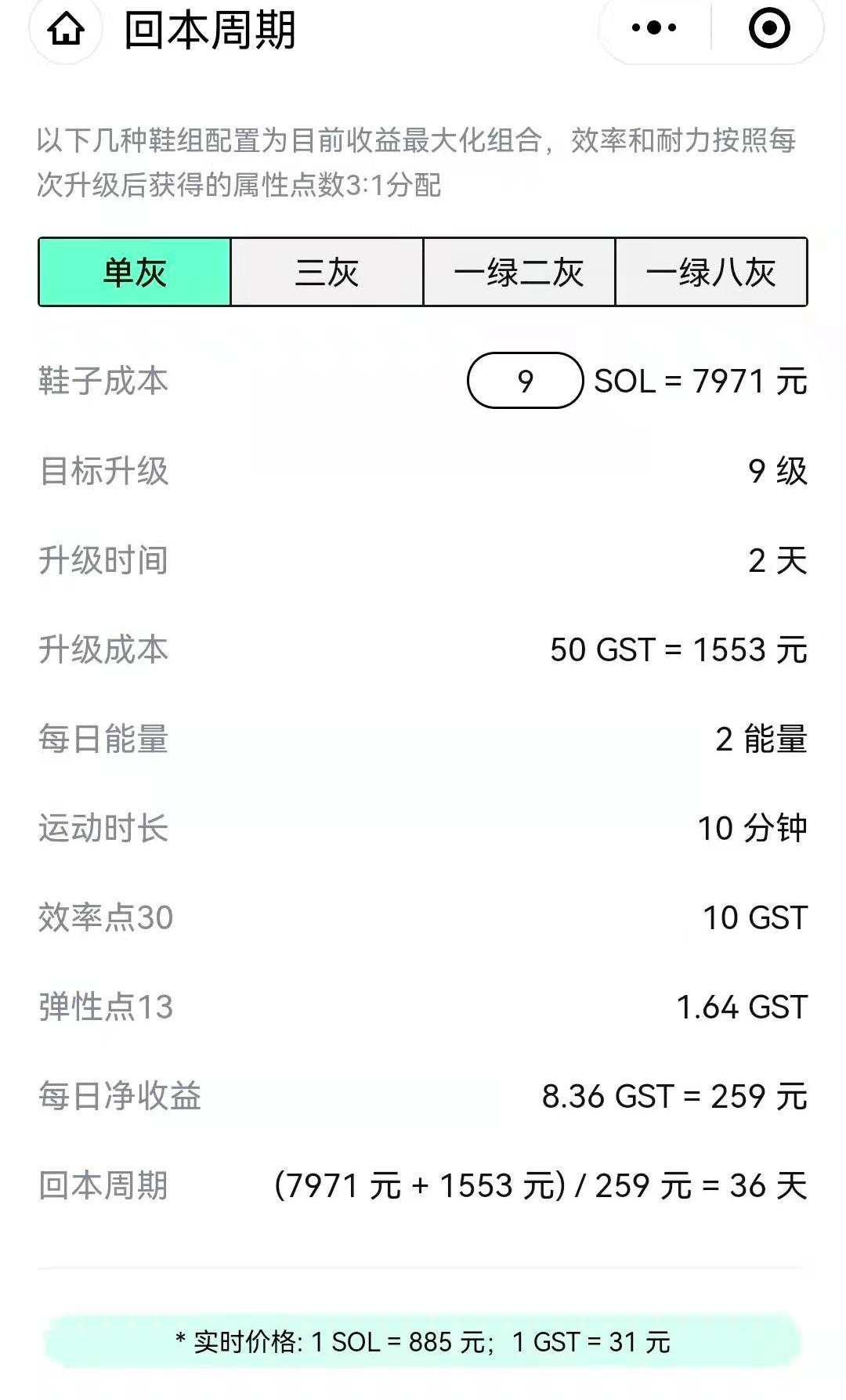 在STEPN中收益最大化的方式,已經被摸索出來了。在一些STEPN社群中,有人專門制作了計算回本周期的小程序助手,單灰、三灰、一綠二灰、一綠八灰被視為是新人入場能收益最大化的組合方式。玩家們也會在群里曬著自己的收益,有擁有14雙灰鞋、1雙綠鞋的打金者聲稱,已經實現了日入3000元,而半個月前還只能日入800元。