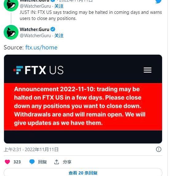 但誰也沒想到,在SBF的強力承諾下,FTXUS在今日已傳出暫停交易,據Watcher.Guru推文顯示,當前官網上方顯示警告稱,FTXUS將可能在數天內暫停交易功能,并請客戶關閉任何艙位,并強調存提款功能都保持開通。