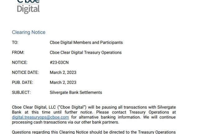 CboeDigital也在第一時間向其會員和參與者發布了澄清通知,將暫停與Silvergate的所有交易,并使用其他銀行合作伙伴處理現金交易。