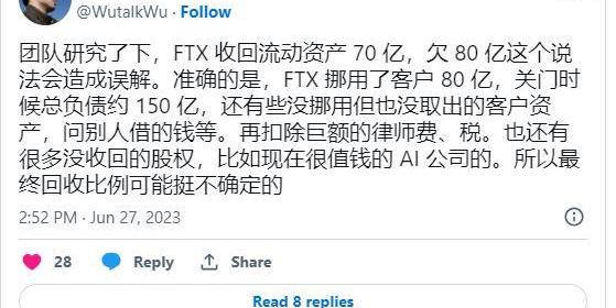 在破產團隊的努力下,FTX目前共追回了價值約70億美元的流動性資產。雖然看似已能償還大部分用戶債務,但《吳說區塊鏈》主編ColinWu卻指出,FTX破產時的總負債約150億美元,包含了沒挪用但也沒取出的用戶資產及其他借款等,若扣除掉必要成本,最終能收回的資產比例仍是未知數。
