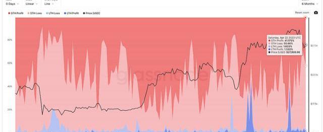 從超過155天沒有移動過的長期持有者數據中可以看到,截止到今天又在繼續提升,當前已經有超過1,422.7萬枚BTC在近半年中沒有參與到換手中。這占了總流動量的73.51%,再次刷新了歷史記錄。所以即便是周末拋壓的重點仍然是短期持有的BTC,尤其是持倉成本在26,500美金以上的BTC是減持的主力。
