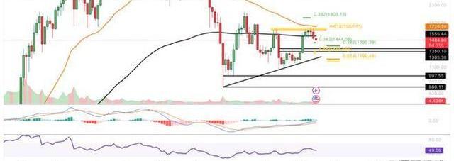 如果以太坊看跌地跌破200周均線支撐位1,556美元左右,以太坊可能會發起修正。然后下一個重要的斐波那契支撐位在1,448美元左右和1,300美元左右。”