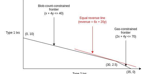 優先費5pergas,4blobs,4totalgas優先費3pergas,1blob,2totalgas遵循幼稚的“降低優先費用”算法的礦工將用第一種類型的10筆交易填充整個區塊,并獲得5*40=200gas的收入。因為這10筆交易填滿了blob完全限制,他們將無法包含更多交易。但最優策略是采取第一種類型的3筆交易和第二種類型的28筆交易。這為您提供了一個包含40blob和68gas的塊,以及5*12+3*56=228的收入。
