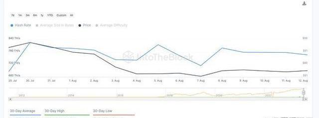 8月2日的減半導致礦工收入從12.5LTC減少至6.25LTC。由于挖礦成本相對穩定,且儲量消耗迅速,一些礦工已經開始退出。IntoTheBlock的數據顯示,7月30日,即減半前幾天,LTC算力約為826TH/s。然而,在8月2日減半后的兩周內,它在8月12日收盤時下跌了約8%至767TH/s。