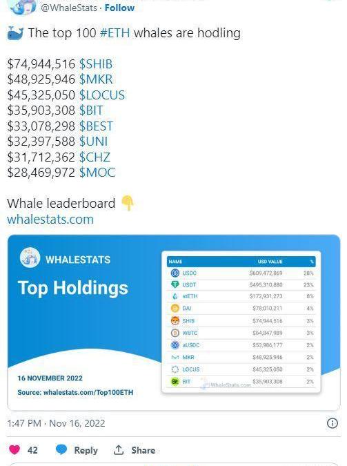 有趣的是,鯨魚對SHIB的信心讓投資者又看到了希望。根據WhaleStats的數據,SHIB在排名前5000的以太坊鯨魚持有的加密貨幣列表中名列前茅。