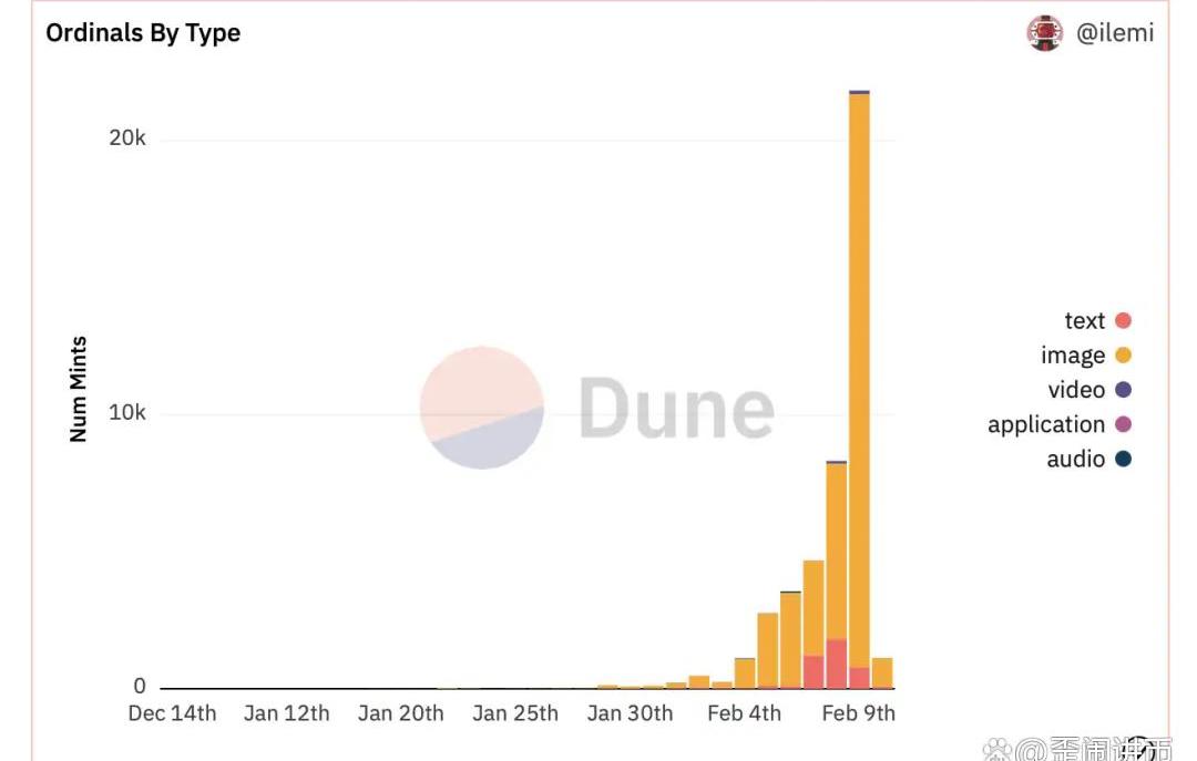 不過在今年3月21日,有近1700萬美元的Cryptopunks被拋售,這次拋售行為將Cryptopunks地板價從75ETH砸至62ETH。從上圖數據看Cryptopunks的價格已經低至到52.99ETH,若再次出現拋售現象,Cryptopunks地板價可能將進一步下跌。另外一個藍籌項目Azuki因為詞源日文,被稱為紅豆,在發布后的一個月內,Azuki的銷售額達到了3億美元,其總銷售額甚至一度超過了CryptoPunks和BAYC,價格雖然不及前兩位“權貴”,但在2022年3月份單價最高曾沖到420ETH,是2022年最熱門的NFT項目之一。但是,進入熊市以后熱度逐漸下降,當前Azuki地板價跌至15ETH左右。知名藝術家創作的Doodles上線不久便成為了藍籌NFT,交易量同樣長期占據NFT市場的前10名,最高價將近60ETH,目前也回落到15.3ETH。除了以上的老牌藍籌NFT外,最近大火的比特幣NFT,即BitcoinOrdinalsNFTs也在3月內被大量鑄造。2023年1月21日軟件工程師CaseyRodarmor發布比特幣網絡NFT協議Ordinals,正式將NFT帶入到比特幣主網。Dune上的數據顯示,OrdinalsNFT在2月以來飛速增長,尤其是圖片類內容。