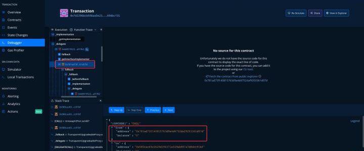 從Debugger中我們可以發現攻擊合約的地址0x781ad73f140815763d9a4d4752daf9203361d07d。