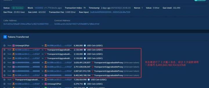 2.用閃電貸借出的6,360,000USDC分成3份,去bHOME中進行2次重入攻擊調用了3次lend()函數鑄造共8,465,943.180104bHOME。