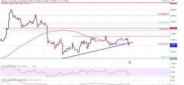 在BTC/USD貨幣對的小時圖上,突破了關鍵看漲趨勢線,支撐位在27,100美元附近。