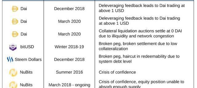 我們總結了幾個值得注意的非托管型穩定幣去杠杠化事件,如表所示。對穩定幣項目的設計者而言,這些事件值得作為案例研究。