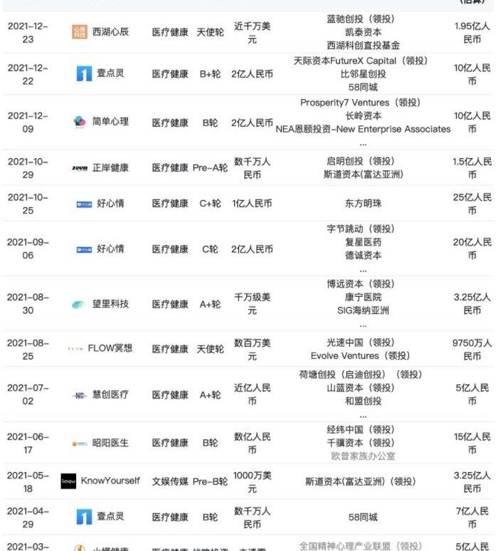 數字化診療平臺和基于人工智能支持的數字療法是國內心理健康領域目前的投資熱點。2021年,在IT桔子歸類為心理健康領域的合計14起投資事件中,「壹點靈」、「簡單心理」、「好心情」、「昭陽醫生」4家公司為互聯網+/數字診療平臺,且均獲得了上億元的投資;「西湖心辰」、「正岸健康」、「望里科技」、「小懂健康」4家公司涉及AI技術或數字療法;此外還包括腦科學醫療器械公司「慧創醫療」、冥想APP「FLOW冥想」和泛心理學平臺「KnowYourself」。