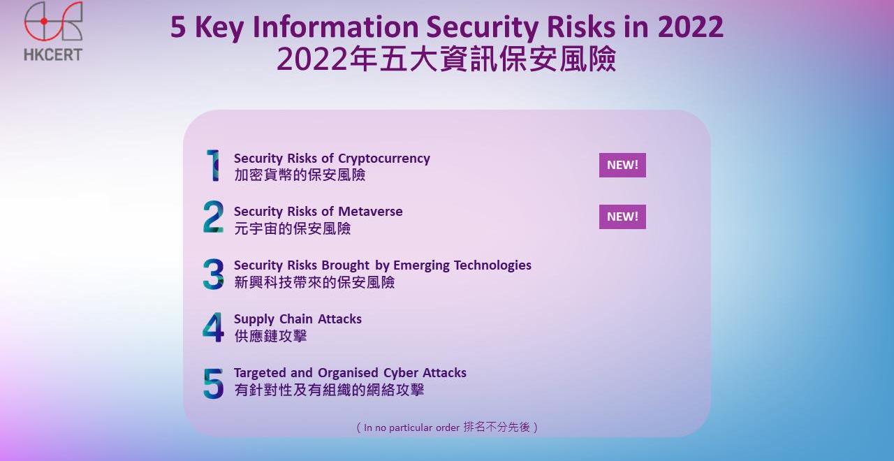 1.NFT及元宇宙涉及新型虛擬資產儲存、交易及大量數據往來,當中亦包含虛擬世界中不同用戶的活動信息,因此相關的資訊安全將備受更大關注;2.加密貨幣價值持續攀升及相關市場不斷擴張,不法分子會從有關的貨幣交易和儲存兩方面入手,盜取用戶敏感資料,進入賬戶轉走貨幣,或作其他惡意用途;3.利用新興科技應用普及和潛在安全漏洞發動的網絡攻擊將趨多元化,如人工智能欺詐、利用QR碼登入的賬戶劫持攻擊等;4.疫情持續將進一步加快供應鏈互連和數字化,透過攻擊第三方服務供應商來入侵最終目標機構的供應鏈攻擊亦會相應上升;5.網絡攻擊將會變得更具針對性及有組織,多重勒索軟件及針對個別行業的釣魚攻擊將成常態。