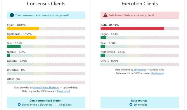 客戶端中心化的問題非常嚴重,甚至像PrysmaticLabs這樣客戶端使用率最高的領先公司都建議節點驗證者“使用他們的競爭對手”。畢竟,如果以太坊崩潰,對所有人來說都是損失。