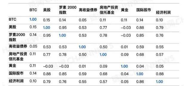 與每股相關性為15%,與高收益債券相關性為5%,房地產信托基金為11%,黃金也是11%,國際股市為14%,與整個社會經濟的利潤之間相關性為10%。比特幣與所有投資品之間的正相關性都沒有超過15%。