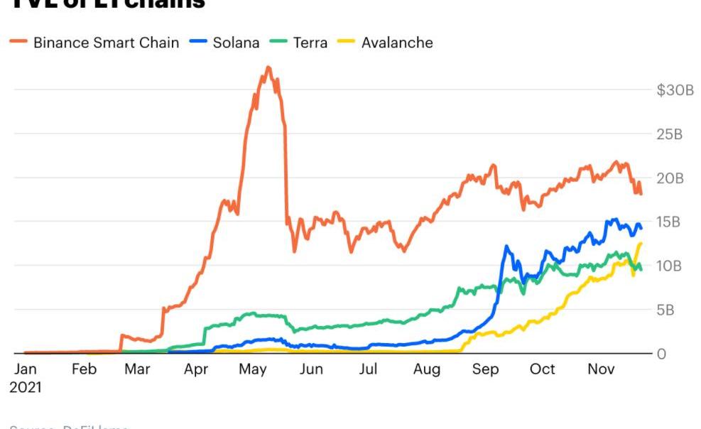 在過去的10個月里,新的第1層成群結隊地上線,這些網絡的總價值在同一時期從0美元飆升至75B美元左右。該領域目前由Solana、Avalanche、Terra和BinanceSmartChain主導,每個鏈都擁有不斷增長的生態系統,價值已超過100億美元。