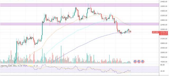 截至發稿時,比特幣價格為21,752美元,在4小時圖的200EMA處獲得支撐。