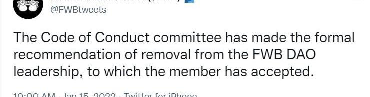 XRP/HKD-0.42%巴比特訊,1月15日,FWB發推表示,其社區成員及領導CooperTurley屢次發表偏激言論違反了社區政策中的相關條款。根據管理程序,由FWB社區成員組成的匿名委員會于1月13日與該成員會面并評估了該事件。目前,行為準則委員會已提出了從FWBDAO領導層對其進行撤職的正式建議,而該成員已經接受。該成員的社區成員身份將被暫時停職至少兩季,之后,可以按照恢復性方法,重新申請DAO成員。