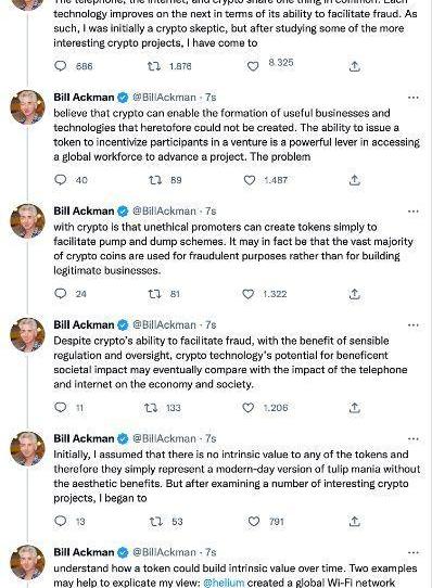 “我最初對加密貨幣持懷疑態度,但在回顧了一些更有趣的加密貨幣項目之后,我開始相信加密貨幣可以創造出以前無法創造的有用業務和技術,”比爾阿克曼在來自11月20日,他的個人Twitter帳戶。PershingSquareCapitalManagement的創始人兼首席執行官阿克曼表示,他認為只要該行業消除不良行為者,加密貨幣就有可能“主要造福社會”。