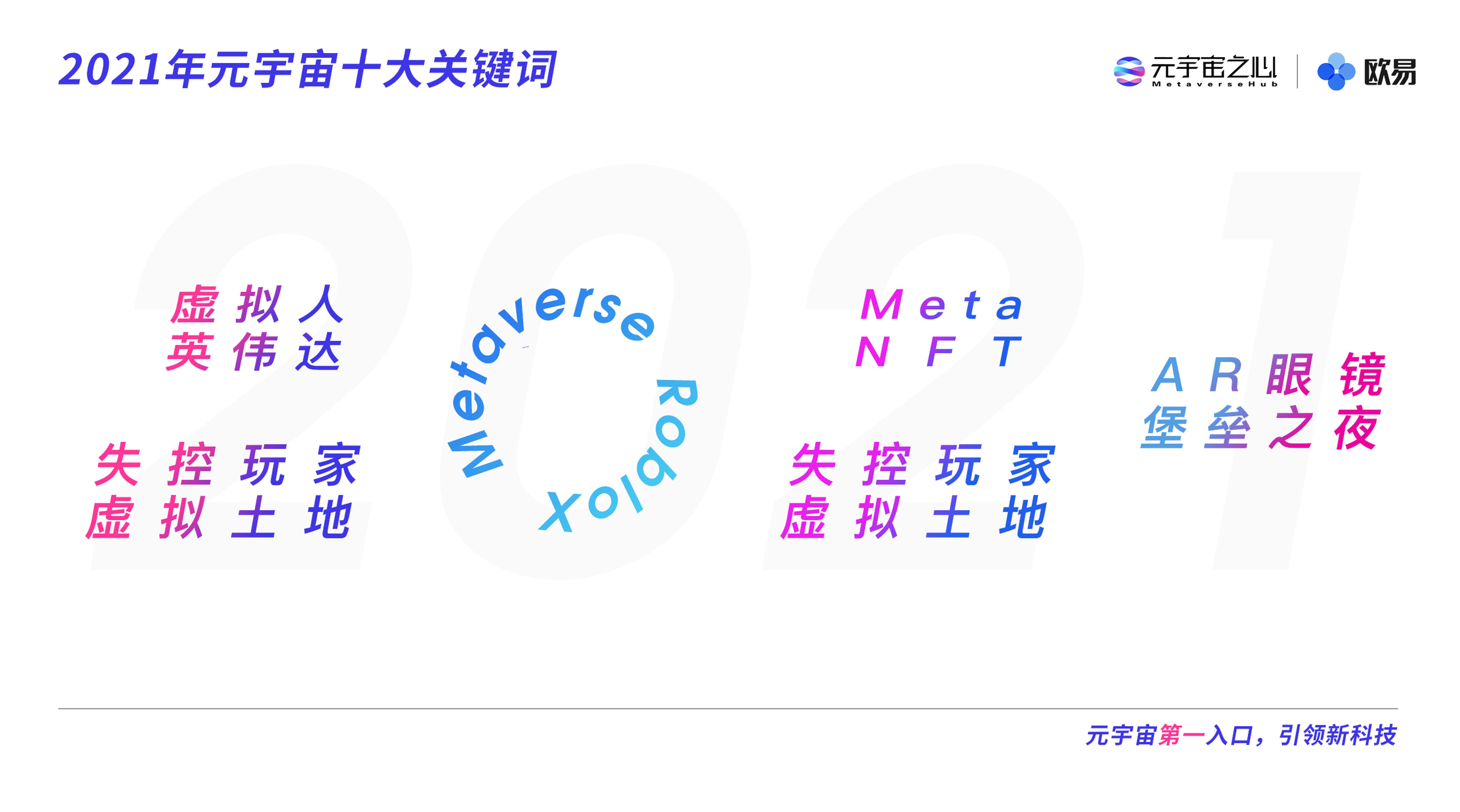 最后我們還是要落腳到元宇宙年度最大的關鍵詞,自然還是Metaverse本身,作為今年科技圈、投資圈甚至營銷圈最熱的詞匯,元宇宙本身當之無愧的成為了最熱門的詞匯,正如我們在文章開頭的描述,手握“2021年度字詞”和“2021年度十大網絡用語”的元宇宙,必然會成為2022年的開年熱潮。