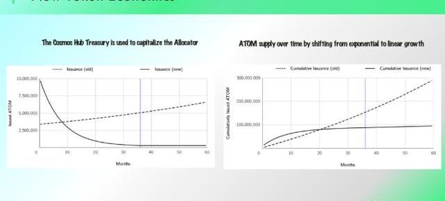貨幣總量減少:社區有機會發展必要的社會基礎設施,以有效管理龐大的資金庫。過渡階段從Cosmos轉向新貨幣政策的那一刻開始,并在36個月后結束,此時穩態階段開始并無限期持續。擬議的新發行模型將從指數增長轉變為線性增長。從貨幣總量來看,ATOM總供應量相較于原有模型顯著降低。
