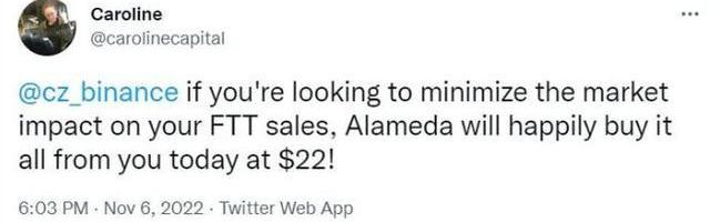 Caroline提出以22美元的價格購買幣安所有的FTT。投資者明白,22美元代表著底線,如果FTT交易價格低于這個價,Alameda就會破產。