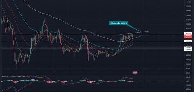 在以太幣價格出現顯著回升之后,價格動能似乎觸及1680美元的上限,導致日線圖出現上漲楔形。然而,考慮到之前的牛市,這種持續的價格走勢代表了一個小的突破期,表明有可能出現長期的上漲趨勢。