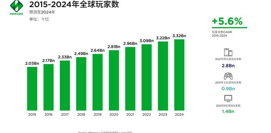 2021年12月22日,Newzoo發布《2021年全球游戲市場報告》,報告顯示,2021年全球游戲玩家總數突破30億,游戲收益總計1758億美元,同比下降1.1%,但Newzoo稱,這一小幅回落并不影響市場總體發展趨勢,到2024年,全球游戲玩家總量將突破33億,其市場規模將達到2187億美元。