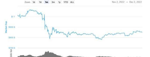 在FTX申請破產的消息傳出后,隨著投資者進入拋售狂潮,其余加密貨幣市場下滑。根據CoinMarketCap的數據,這導致加密貨幣總市值降至1萬億美元以下。