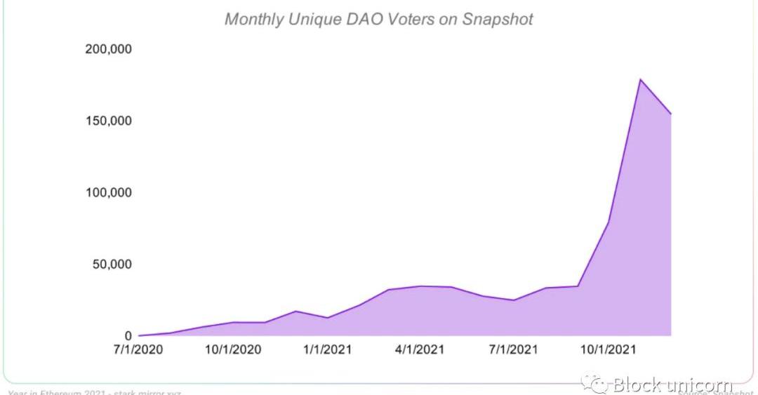 在Snapshot上參與DAO的唯一月度選民數量全年都在增長,并在11月和12月呈爆炸式增長: