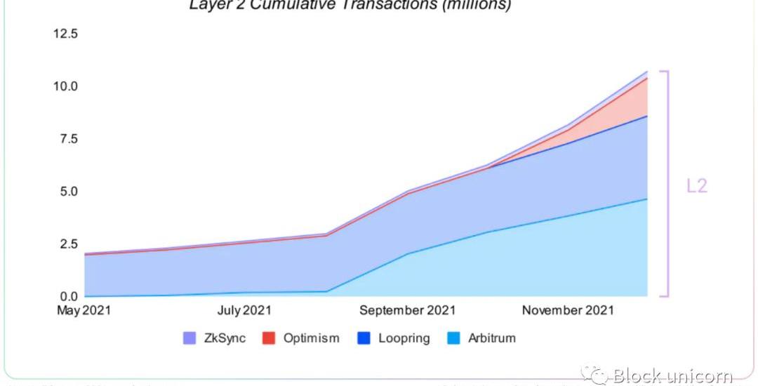 該圖向我們展示了2021年以太坊上的總累計交易,包括L1和L2。2021年,以太坊的L1每天進行約120萬筆交易。隨著Layer2協議上線,以太坊的有效容量開始增加,綜合交易率開始向上彎曲。