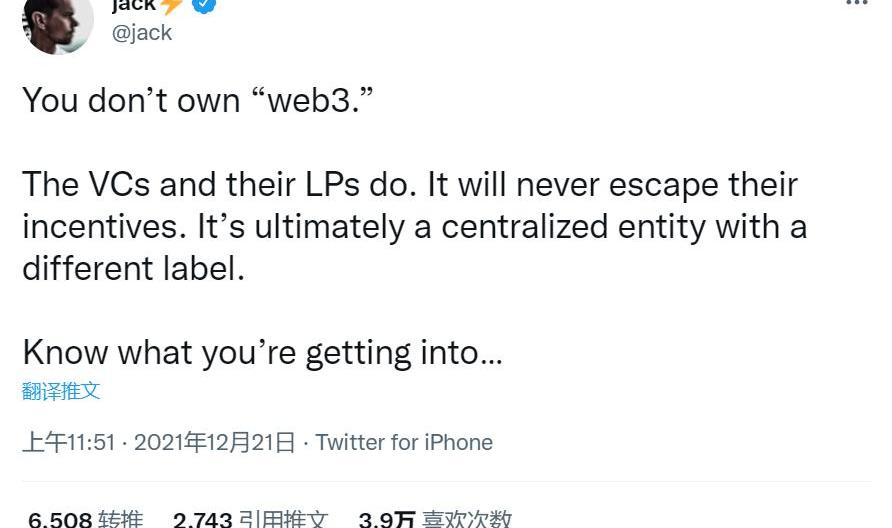 而Dorsey則給出了他的反駁,「推特起初就是一個公司,從一開始就是這樣。」Dorsey認為,「Web3.0也有同樣的企業激勵機制,但這隱匿在『去中心化』之下。」