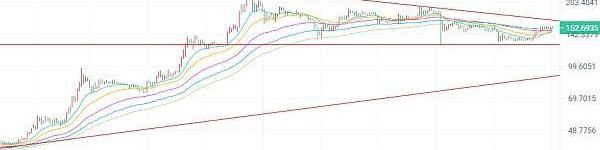 4小時布林帶地位向上開口,K線從突破布林帶上軌后回落至上行軌道,KDJ高位向下交叉成型,MACD放量減少,DIF和DEA上行遇阻力,4小時EMA15移動平均線已經走過EMA30,上行沖擊EMA60遇阻力,綜合判斷FIL整體走勢還是偏弱,短期內不會沖破上方三角口165.53,操作建議,短期內高空為主,多為輔,行情瞬息萬變,具體操作以實時策略為主,分析內容主做參考