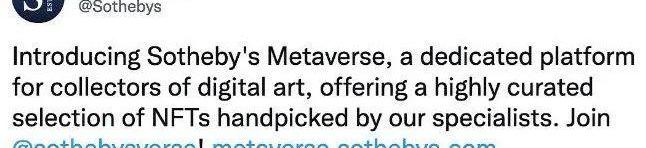 另外,還在官網推出專題頁面“蘇富比的元宇宙”,表示將會圍繞「蘇富比元宇宙」打造新的行業生態系統,并讓蘇富比在未來能夠在一些重要的NFT行業活動中奪得C位,并擁有包括動態拍賣和鑄造藝術作品的能力。