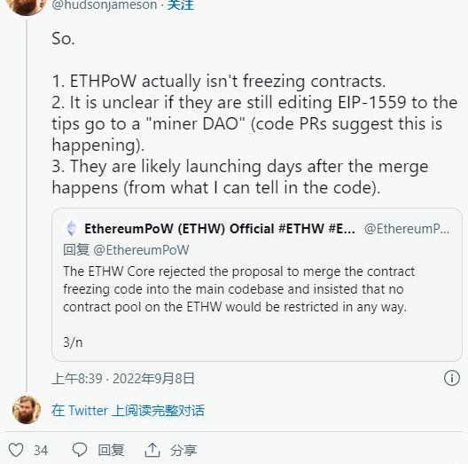 前以太坊基金會成員哈德森詹姆森在9月8日想知道為什么它在實際合并之后推出。
