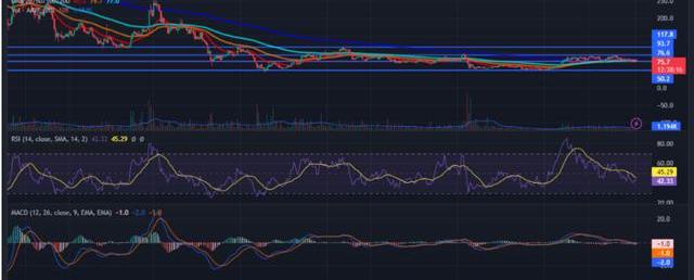 Aave價格分析表明該代幣目前處于下跌趨勢。可以說2022年對于代幣來說并不是一個好年頭,因為全年都處于賣方的主導地位,這可以從每日交易K線走勢圖中看出。2023年初之后,代幣開始上漲,但在達到其主要阻力位后開始盤整。交易量的增加表明市場對該代幣的積極情緒。根據技術指標,RSI和MACD都在下跌,表明當前看跌趨勢的強度。交易者應在市場上謹慎交易