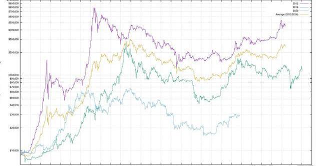 這是迄今為止三個比特幣減半之后從減半日期到價格峰值的表現: