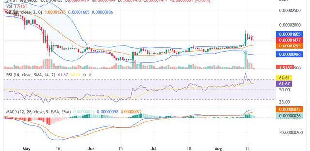 ShibaInu的每日蠟燭開盤價為0.00001479美元,達到每日最高點0.00001499美元。此外,該代幣的每日最低價為0.00001470美元。在撰寫本文時,1SHIB的價格為0.00001477美元。