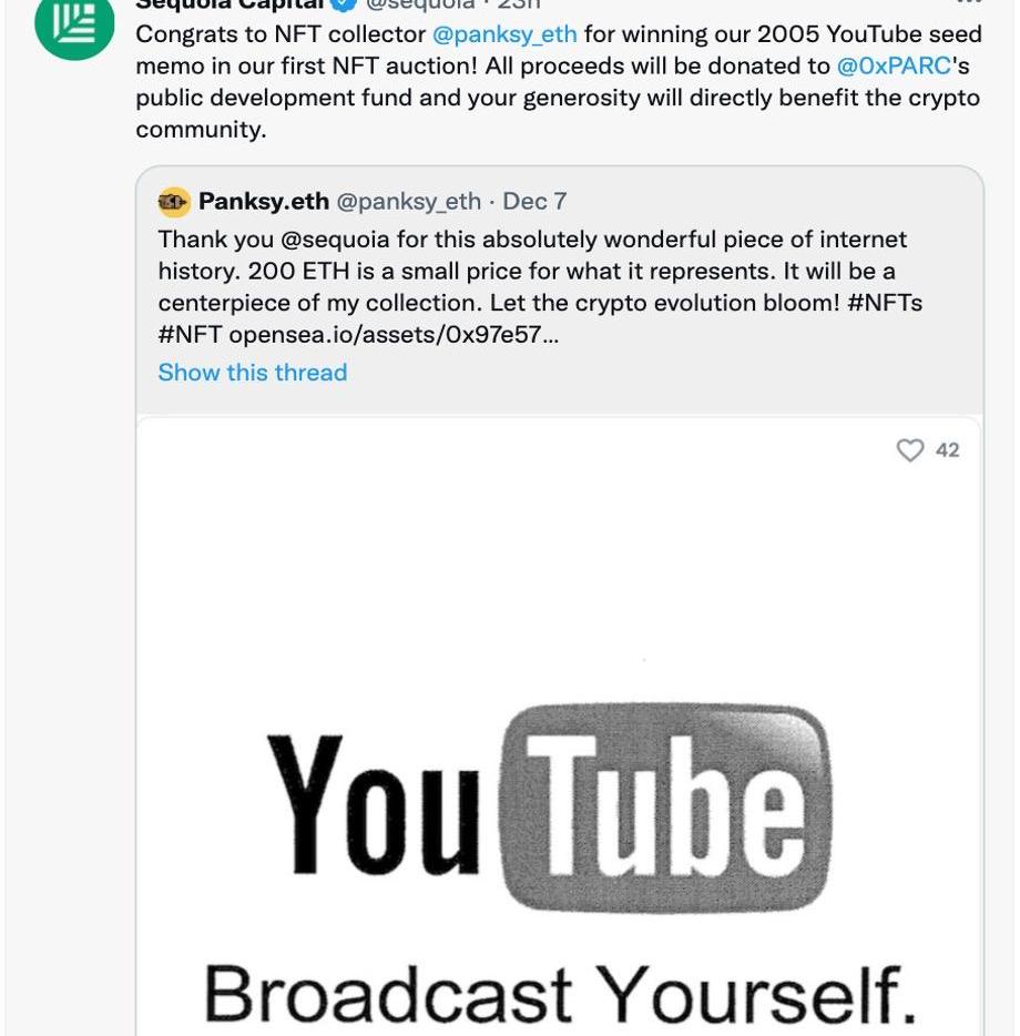 而就在一周前,紅杉資本還首次玩起了NFT。12月3日,紅杉資本發文表示將把自己2005年的YouTube投資備忘錄以NFT的形式拍賣。拍賣在Opensea上進行,任何人都可以競拍,所得收益將用于0xPARC的公共生態系統基金。