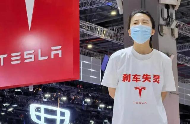 4月19日上午消息,2021年上海國際車展媒體日首日,特斯拉的展臺上出現一位穿著“剎車失靈”和特斯拉標識T恤的女士進行維權。