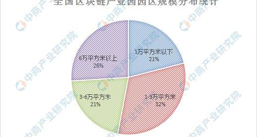 國內22家區塊鏈產業園區中,規模在3萬㎡以下園區數量最多,占比達到53%;其中1萬㎡以下規模的園區占比為21%,1—3萬㎡規模的園區占比為32%。規模在6萬㎡以上的園區占比為26%,但這類區塊鏈產業園區通常設立在其它綜合型園區內,很難統計其區塊鏈行業實際使用面積。