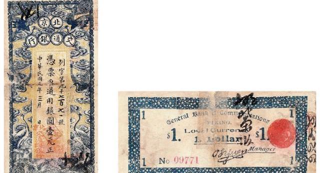 民國元年北京交通銀行大銀圓券壹元一枚,祥云仙鶴圖,直型,列字第九千七百七一號,正式流通券。交通銀行成立于光緒三十二年,經營路、電、郵、航四政的收支業務。民國成立后,該行繼續經營,并改發通用銀元票,又稱大銀元票,計有壹圓、伍圓、拾圓三等面值券。紙幣圖案舍棄龍圖,改用鶴圖。