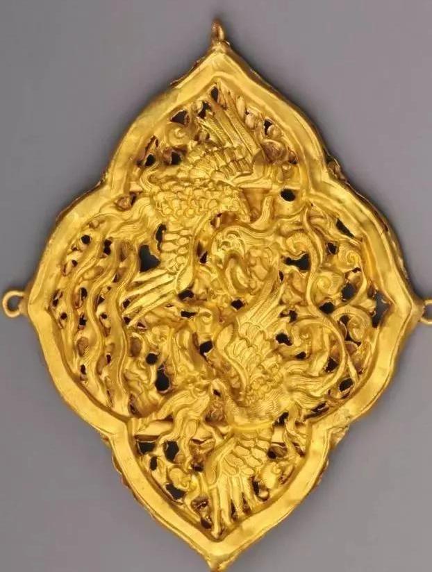 說明:略呈菱形,應為霞帔下端的墜飾。由兩片金片鏤空紋飾焊合而成,每邊用曲線勾成。圖案為兩鳳起舞,寓意“和鳴”。