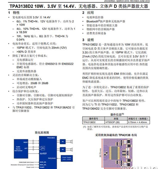 TI德州儀器的TPA3138D2,D類立體聲音頻放大器,支持無電感器運行,支持3.5V至14.4V寬電壓工作范圍,1SPW模式下空閑電流僅為20mA,適用于便攜式應用,這款產品采用單聲道輸出。