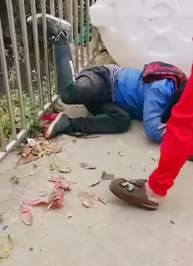 隨后村民將鐵鏈的另一端綁在了欄桿上,偷狗男子因為右腳被拴了鐵鏈,右腿被吊在了半空中。