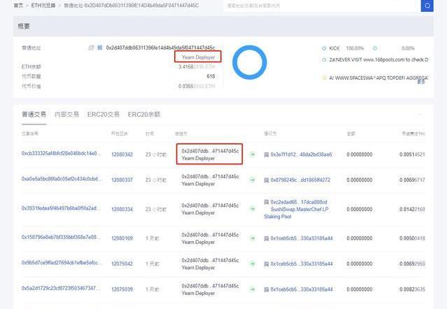 該以太坊地址創建于2020年8月中旬。我們發現,盡管該地址目前僅持有100余枚以太坊,不過其持有的其他DeFi代幣價值已超過45萬枚以太坊。