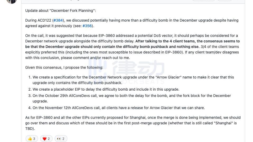 TimBeiko表示,在電話會議上,有人建議由于EIP-3860解決了一個潛在的DoS向量,或許應該考慮12月的網絡升級和難度炸彈延遲計劃。在與4個客戶團隊交談之后,大家達成的共識是12月份的升級應該只包含推遲難度炸彈,不會有其他的內容。3/4的客戶端團隊明確傾向于這個結果(包括最容易受到EIP-3860所述問題影響的團隊)。在10月29日的AllCoreDevs電話中,開發者們會同意推遲炸彈,并同意12月升級的版本。