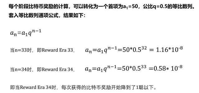 我們可以用高中學習的數列知識來理解這一過程。每個階段“挖礦”成功一次獲取的比特幣獎勵的計算,可以轉化為一個首項a1=50,公比q=0.5的等比數列。套入等比數列通項公式,結果如下,和上表一致。