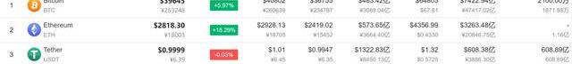以太坊兌美元日內漲超15%,現報2818.3美元/枚。